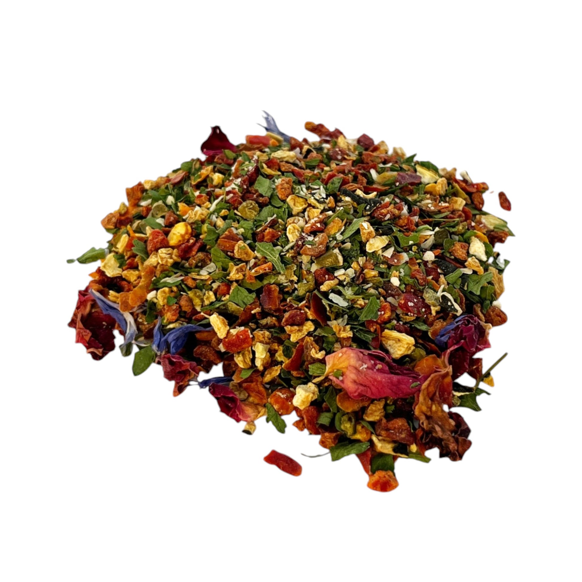 Zucchini, Zwiebeln, Knoblauch, Petersilie, Tomaten, Paprika, Salz, Hibiskusblüten, Lavendel, Rosenblütenblätter, Ringelblumenblätter, Kornblumenblätter. Kann Spuren von Allergenen enthalten.